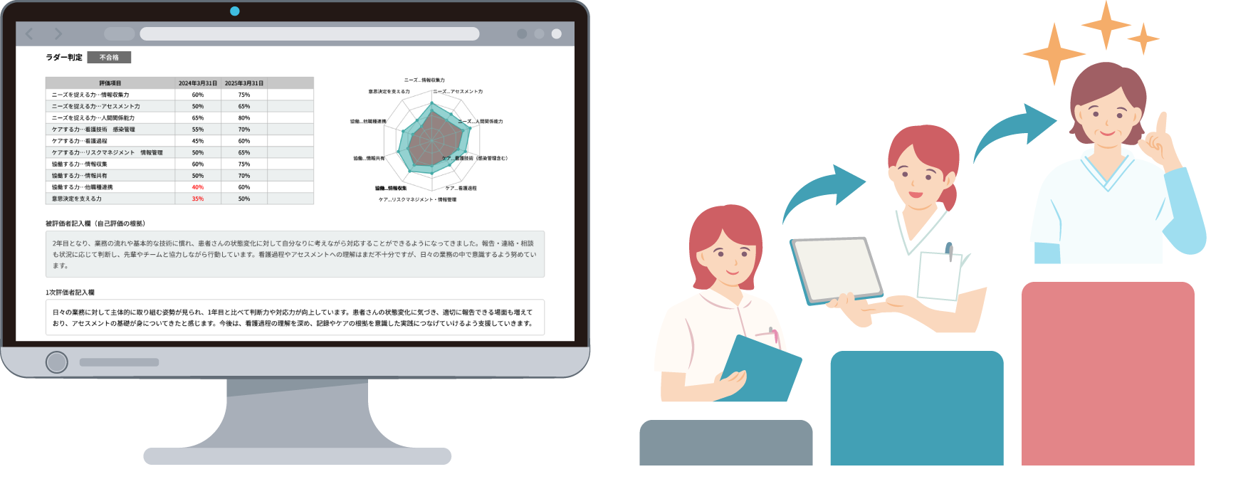 ラダー管理をDX化することで、評価のプロセスや基準が誰にとっても分かりやすくなり、透明性の高い運用が可能になります。これまで属人的になりやすかった評価がデータに基づくものへと変わり、看護師一人ひとりのスキルや努力が正しく反映されるようになります。
