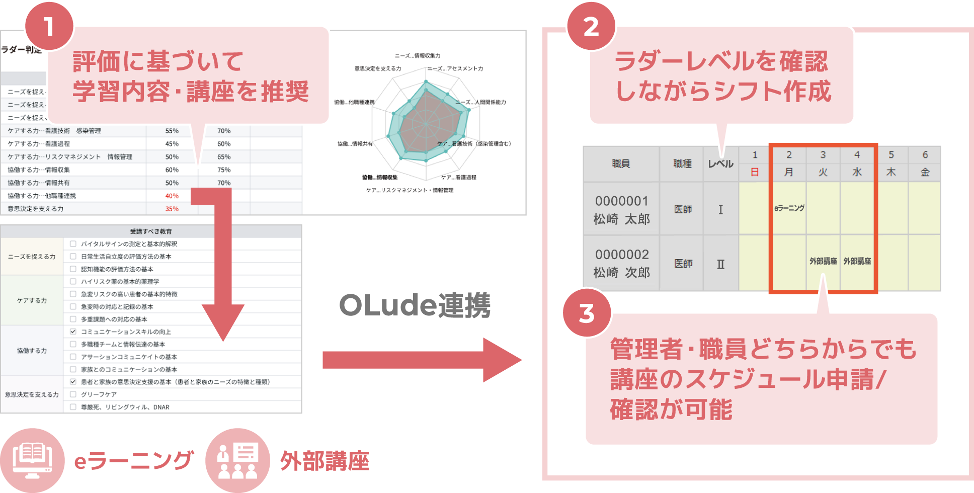 ラダーレベルや受講計画は、シフト勤怠管理システムOLudeと連携することで、職員情報やシフト表に反映可能です。